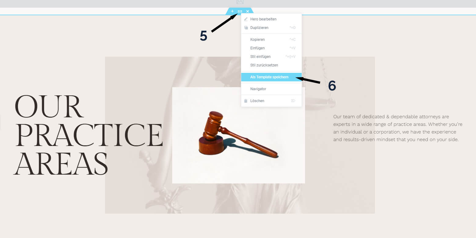 Ebenso können Sie jede Section als Template speichern. Klicken Sie dazu in die entsprechende Section und dann auf die Punkte (5) mit der rechten Maustaste. Es öffnet sich ein kleines Menü. In dem wählen Sie die Option „Als Template speichern“ (6). Sie geben dann einen Namen ein und können damit das eigene Template in der Elementor Library speichern und dann nutzen.